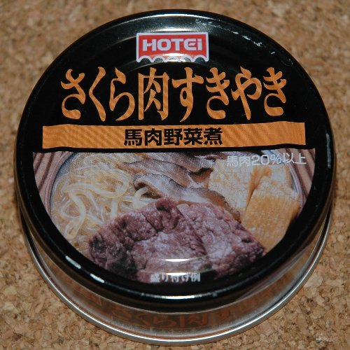 ホテイのさくら肉すき焼きです。 購入価格は98円、60キロカロリーです。 桜肉、糸コン、シイタケ、タケノコが入っています。 味付けはかなり甘口。 肉は2切れでしたが、固形量が50gなので ほかの野菜とのバランスは取れていると思います。 ホテイの肉缶ラインナップ ホテイHP おなじみの焼き鳥缶など。 さくら肉の缶詰。 にほんブログ村