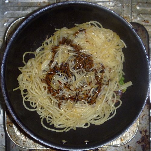 パスタ焼そばを作ります。 材料はパスタ200g、 カップ麺のかやく3袋、 カップ焼そばの液体ソース1袋。 かやくはあり合わせのモノをテキトーに。 液体ソースはイオンのモノです。 茹であがったパスタを投入。 中火で1分くらい焼きます。 強火にしてかやくを投入。 混ぜます。 お役立ちサイト。 具材が長持ちする理由 (社)日本即席食品工業協会 日本最大級ショッピングサイト! お買い物なら楽天市場 PR |