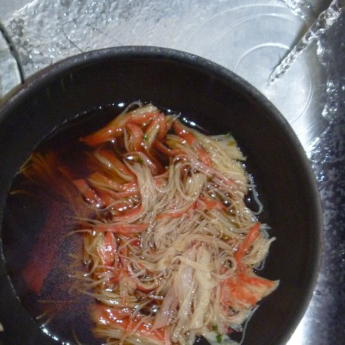冷たいパスタを作ります。 材料はパスタ200g、しょうゆ味の粉末スープ1袋、 カニかま1パック。 他にお好みの野菜があれば入れて下さい。 後で冷やすので 堅くなる分、長めにゆでます。 いつもは11分なので 12分にしました。 水200mlを火にかけ 沸騰させます。 野菜を入れる場合は ここで茹でて下さい。 粉末スープを投入。 火を止めます。 事前に作って冷やしておくと さらに良いですが 面倒なときはこのままでも… 鍋を氷水に浸けるなど ご自由に。 容器に水を入れてこぼす事、4回。 蒲鉾ものしり図鑑 鈴廣かまぼこ博物館。 暑い季節はすっきりした冷製パスタで食欲アップ。 PR |