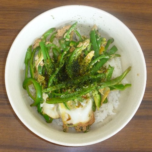 ピーマン丼です。 材料はご飯3/4合分、ピーマン3個、玉子1個、 粉末スープ1袋、インスタント焼そばの青のり1袋。 味は粉末スープの量で加減してください。 千切りにします。 1袋だと多すぎのようです。 改善の余地アリ。 ちょっとツユダクになります。 粉末スープ半袋、水30mlくらいで 良かったかも。 レンジ(600w)で1分半チン。 ご飯を盛っておきます。 完成です。 お役立ちサイト。 やさいのはたらき 独立行政法人農畜産業振興機構 日本最大級ショッピングサイト! お買い物なら楽天市場 PR |